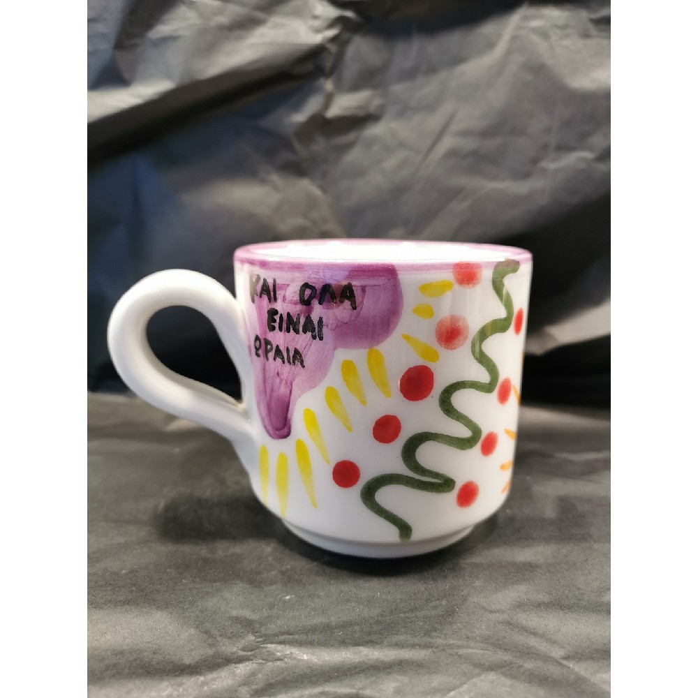 Χειροποίητη κεραμική κούπα. Χωρητικότητας: 300ml. Διαστάσεις: Διάμετρος: 9εκ.& Ύψος: 8εκ. Όλες οι κούπες είναι ζωγραφισμένες στο χέρι και μπορεί να υπάρχουν αποκλίσεις, όλα τα χρώματα από κοντά είναι λίγο πιο έντονα, είναι κατάλληλο για χρήση και μπαίνουν στο πλυντήριο πιάτων.
